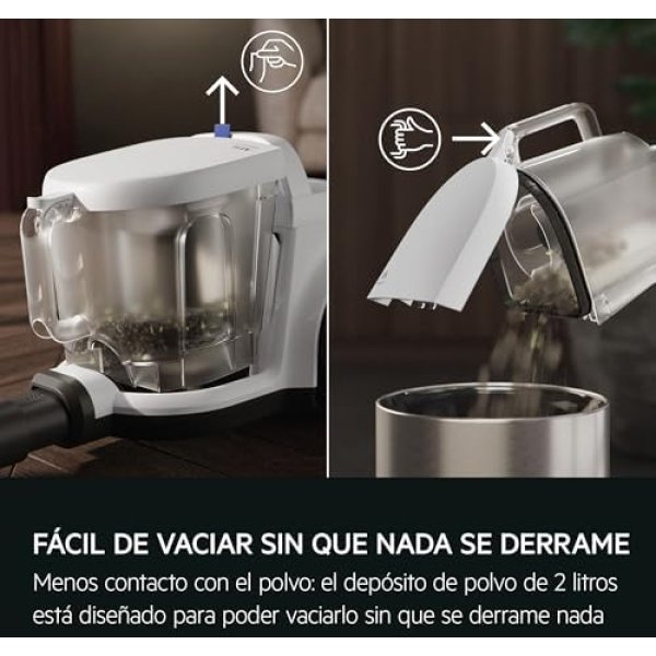 - El depósito de 2 l está diseñado para un vaciado fácil sin líos, vertidos, contacto con el polvo ni nubes de polvo. Basta con tirar de la etiqueta, levantar el depósito y abrir la tapa para eliminar la suciedad fácilmente.