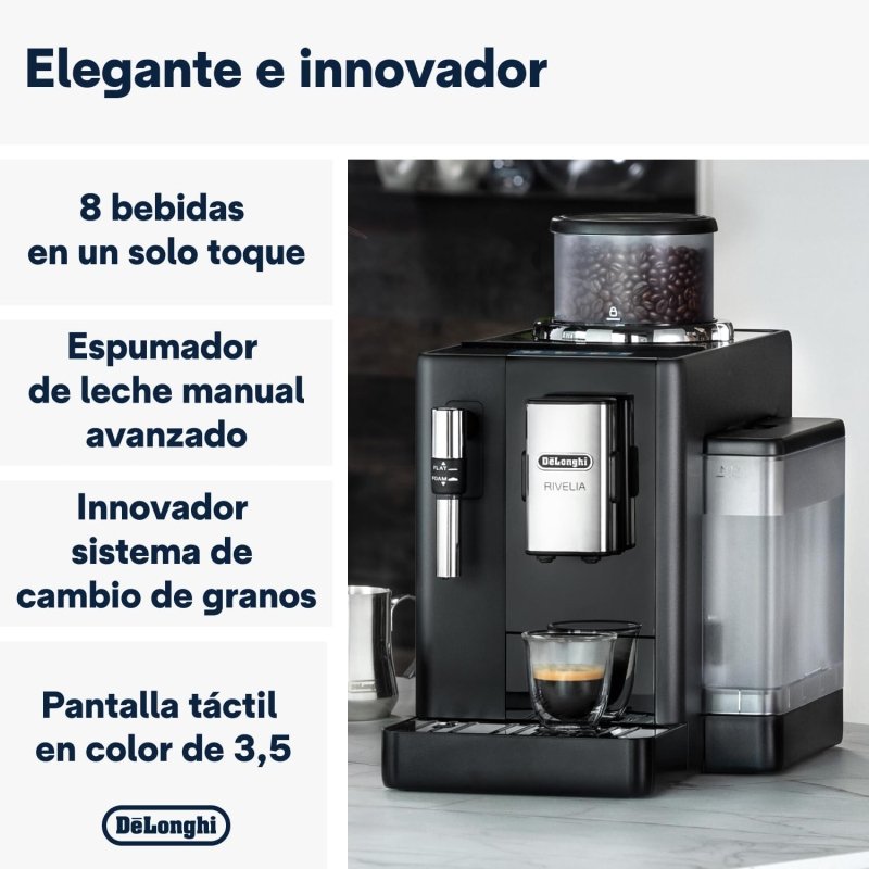 La De’Longhi Rivelia EXAM440.35.B es una cafetera superautomática de color negro que funciona con una presión de bomba de 19 bares. Este modelo integra un depósito de agua con capacidad de 1,4 litros y es compatible tanto con café en grano como con café molido. El dispositivo destaca por su sistema Bean Switch, que permite intercambiar depósitos de granos de 250 gramos de forma sencilla. Incluye una pantalla táctil a color de 3,5 pulgadas desde la cual se gestionan 8 recetas de café preprogramadas y perfiles de usuario personalizados. Además, dispone de un vaporizador de leche manual para la elaboración de espuma y un molinillo cónico de acero con tecnología Bean Adapt.