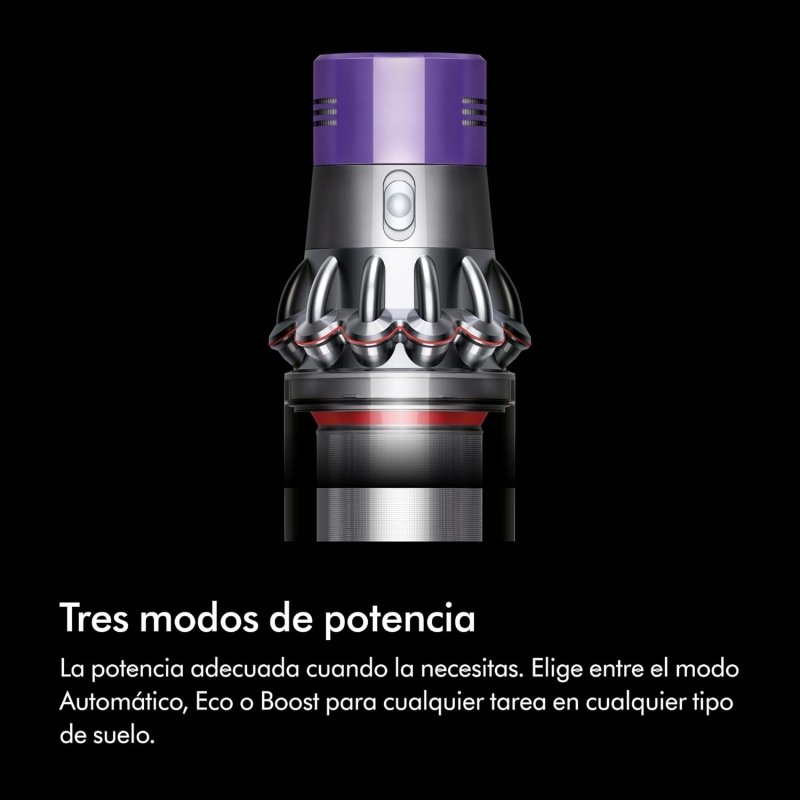 La Dyson Cyclone V10 es una aspiradora de tipo escoba sin cable configurada en color níquel y violeta. Este dispositivo integra un motor digital que genera una potencia de succión de 151 AW y utiliza un sistema de filtración HEPA. El depósito de residuos tiene una capacidad de 0,76 litros y cuenta con un mecanismo de vaciado higiénico. La batería proporciona una autonomía de hasta 60 minutos de funcionamiento y requiere un tiempo de carga de 3,5 horas. El equipo dispone de tres modos de potencia ajustables según la superficie y no incluye función de fregado. El modelo opera de forma inalámbrica y no posee conectividad con aplicaciones móviles.