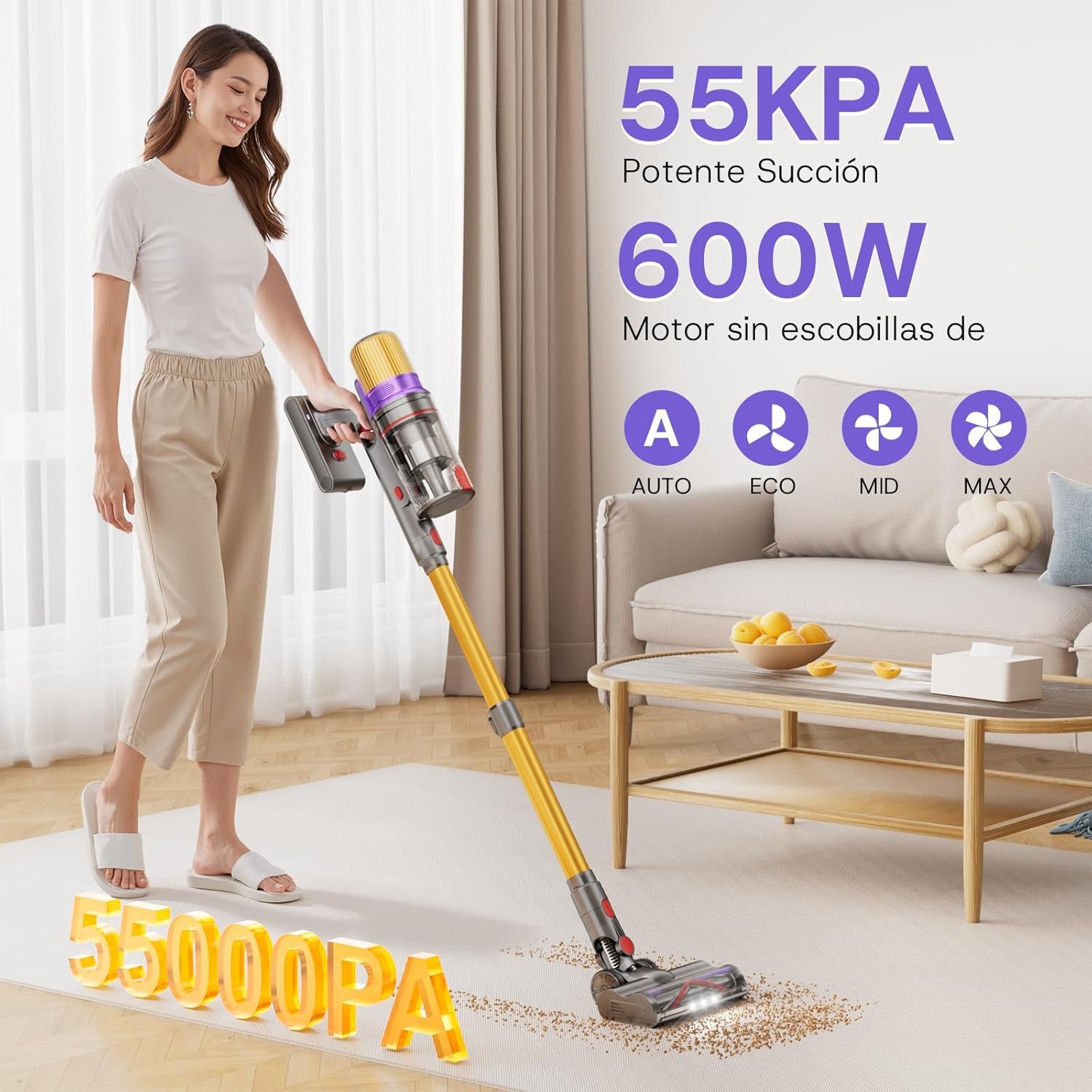- 【Potente succión de 55KPa】 Con un motor sin escobillas de 600W, el V16 elimina polvo, pelo y suciedad de alfombras, baldosas y suelos de madera.