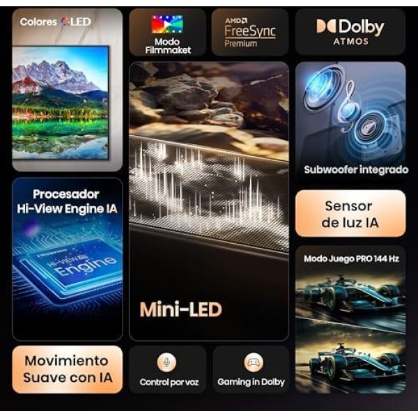 - Hi-View AI Procesador: El Motor Hi-View AI siempre ofrece el viaje visual óptimo. Funciones como el AI 4K Upscaler transforman tu contenido favorito en una calidad 4K impresionante. No importa cuál sea el contenido, siempre se ve mejor que nunca.