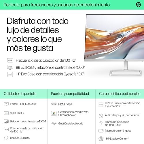 - Panel IPS de 23,8 pulgadas, Full HD (1920 x 1080p) a 100 Hz, con una diagonal de 60,5 cm, campo de visión 16:9, 300 Nits, tiempo de respuesta de 5 ms, contraste 1500:1, Volumen de color 99% sRGB