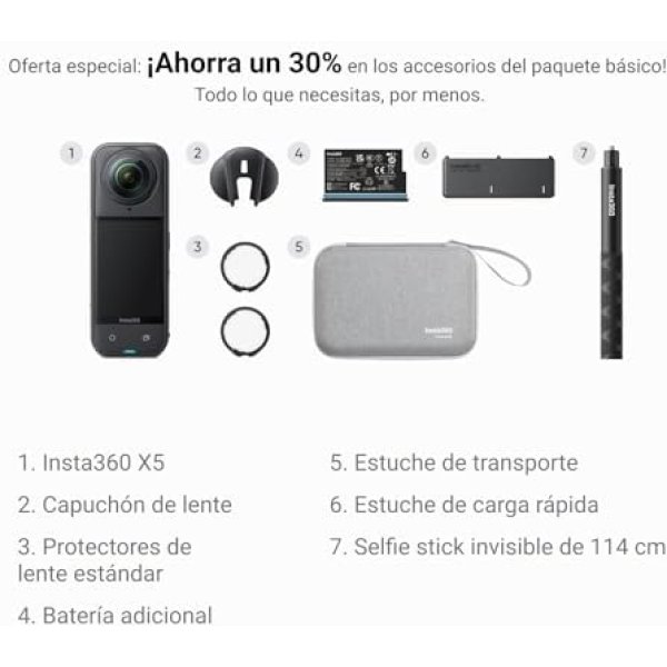 - En la caja: 1× Insta360 X5 (paquete independiente), 1x capuchón de lente, 1x selfie stick invisible de 114 cm, 1x batería para X5, 1x estuche de carga rápida, 1x protectores de lente estándar, 1x estuche de transporte. *La tarjeta microSD se vende por separado.