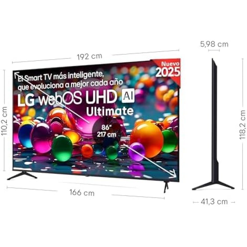 El televisor LG 86UA75006LA cuenta con una pantalla de 86 pulgadas con resolución UHD 4K y tecnología de panel LED con retroiluminación Direct LED. Este modelo incorpora el procesador α7 AI Processor 4K Gen8, diseñado para optimizar la calidad de imagen y el procesamiento de sonido mediante inteligencia artificial. El dispositivo es compatible con formatos de alto rango dinámico como HDR10 Pro y HLG, permitiendo una reproducción de contenido con niveles de contraste optimizados. La plataforma Smart TV está gestionada por el sistema operativo webOS 25, que facilita el acceso a servicios de streaming y la integración con asistentes de voz. Su conectividad incluye tres puertos HDMI 2.1 con soporte para funciones avanzadas y conexiones inalámbricas mediante Wi-Fi 5 y Bluetooth 5.1.