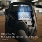 - Equipado con un filtro HEPA AirClean para un filtrado del 99,999 % de las partículas finas y alérgenos, para alfombras, suelos de madera dura y azulejos más limpios *según la norma EN 60312-1