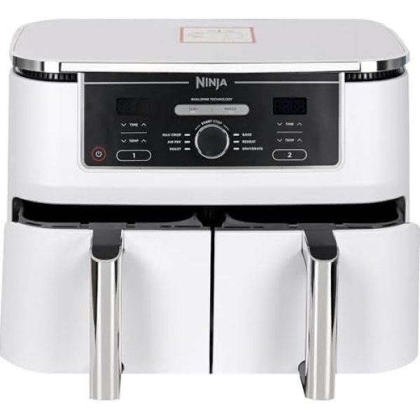 - INCLUYENTE: Fryer de aire de doble zona Foodi (enchufe UE), 2 cajones antiadherentes para lavavajillas (capacidad total 9,5 l) y placas crujientes. Guía de recetas creada por los chefs. Color: blanco