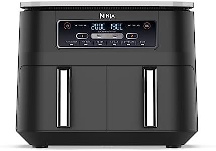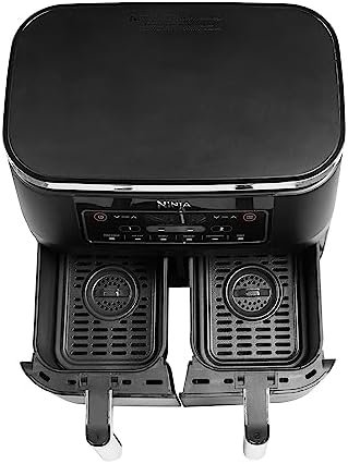 - INCLUYE: Freidora de aire Ninja Foodi con compartimento doble (enchufe UE), 2 cestas (capacidad total de 7,6 l) y rejillas base, antihaderentes y aptas para lavavajillas, y guía de recetas creadas por chefs. Color: Negro