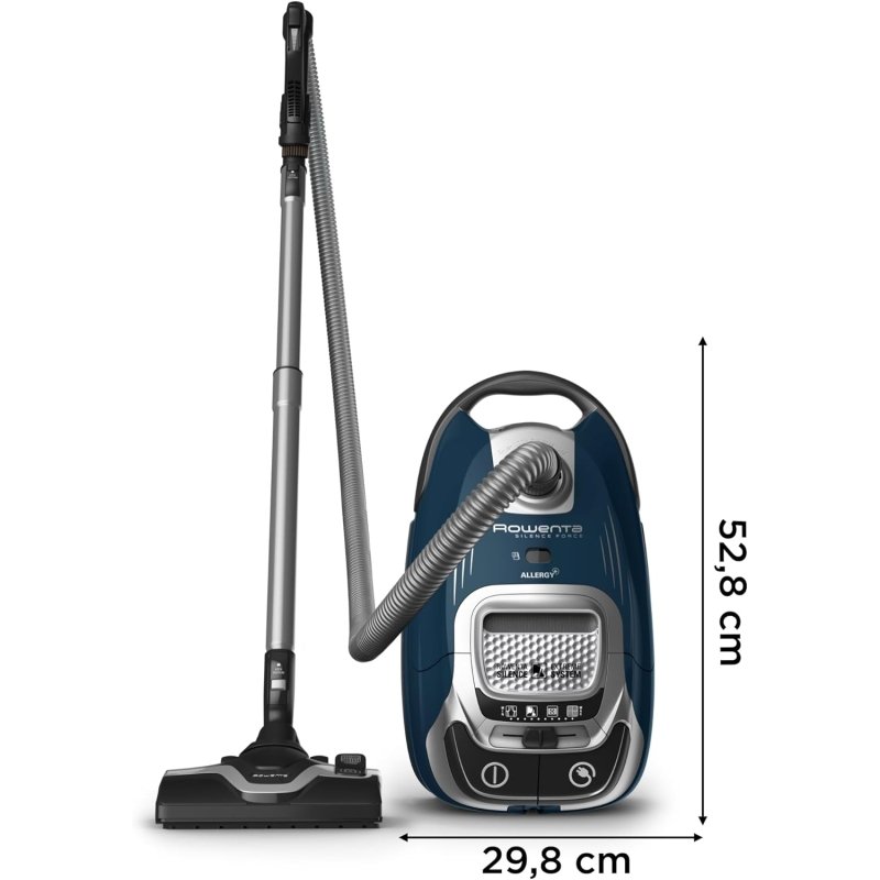 La aspiradora Rowenta Silence Force Effitech es un modelo de tipo trineo con bolsa destinado a la limpieza de superficies domésticas. Incorpora un motor con tecnología Effitech de 400 W y un sistema de filtración de alta eficiencia con filtro HEPA. El compartimento para residuos admite bolsas Hygiene+ con una capacidad total de 4,5 litros. Dispone de un nivel sonoro de 57 dB y un cable de alimentación con una longitud de 8,4 metros. Su radio de acción alcanza los 12 metros considerando la extensión del tubo telescópico y la manguera flexible.