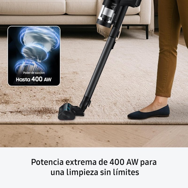 La Samsung Bespoke AI Jet Ultra 400AW es una aspiradora de tipo escoba sin cable configurada para la limpieza de superficies sólidas y textiles. Este equipo integra un motor HexaJet que genera una potencia de succión de 400 AW y emplea un sistema de filtración multicapa tipo HEPA. El dispositivo incluye un depósito de 0,5 litros y proporciona una autonomía máxima de 100 minutos por ciclo de batería. Se suministra en color Satin Black junto con la base All-in-One Clean Station diseñada para el vaciado automático del contenedor. El control de las funciones se realiza mediante una pantalla LCD y vinculación inalámbrica con la plataforma SmartThings.