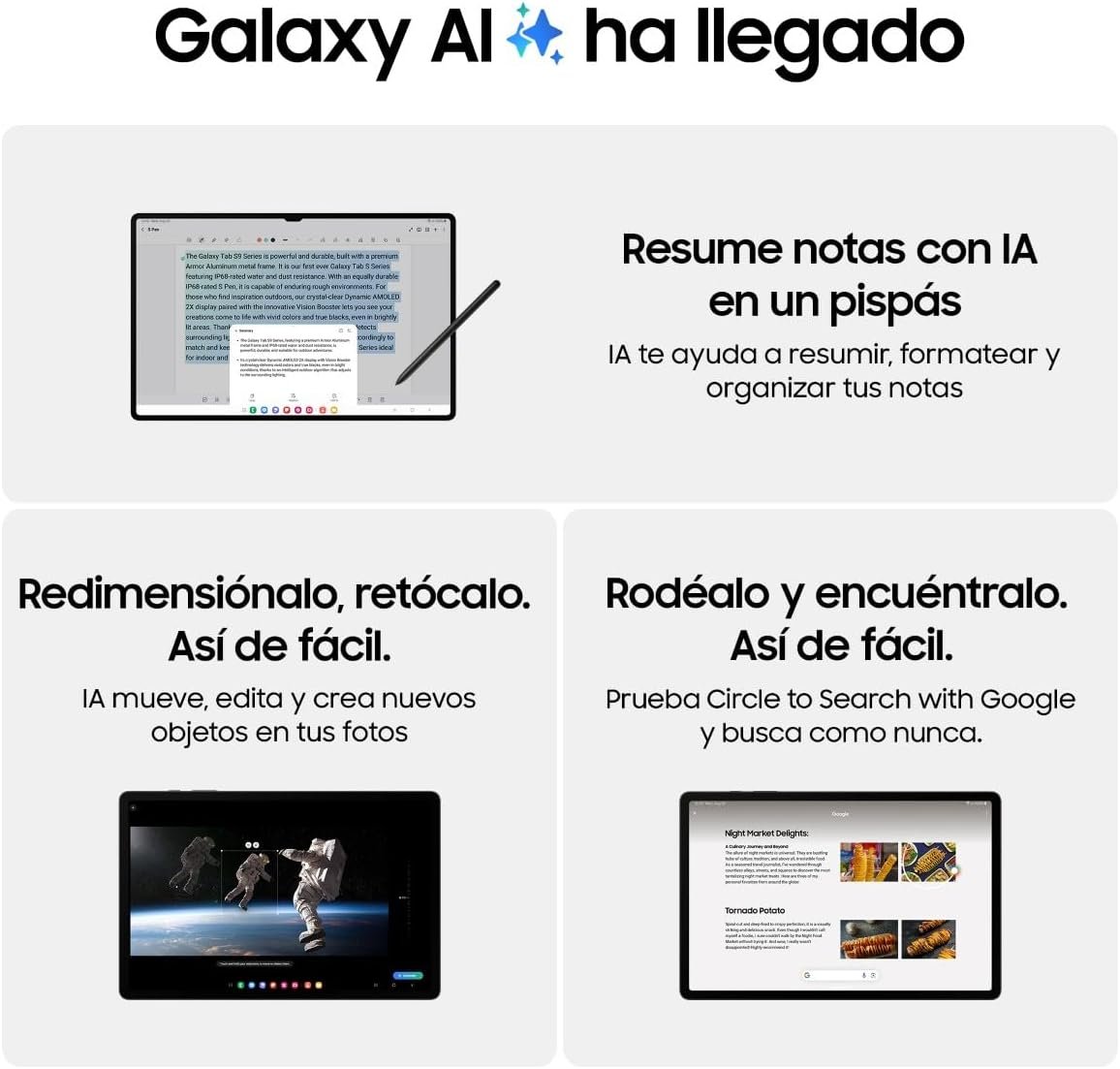 - Experimenta otro nivel de eficiencia con las funciones impulsadas por IA en la serie Galaxy Tab S9, Google Circle to Search encuentra resultados al instante, Note Assist transforma las notas en resúmenes concisos y Photo Assist mejora tus fotos ajustando y eliminando objetos