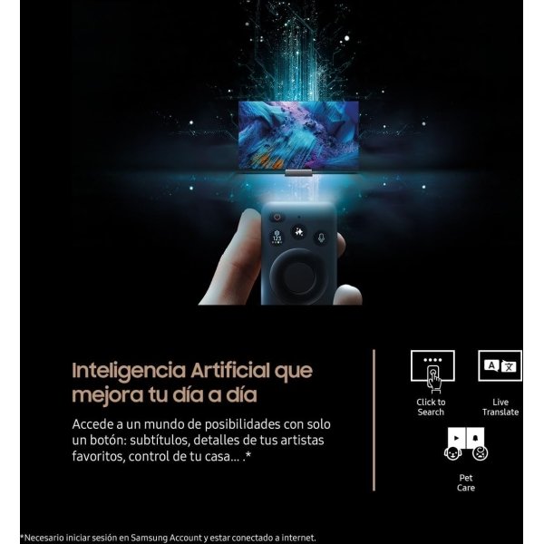 - Inteligencia Artificial que mejora tu día a día con Samsung Vision AI: Accede a un mundo de posibilidades con un solo botón: subtítulos, detalles de tus artistas favoritos, control de tu casa…