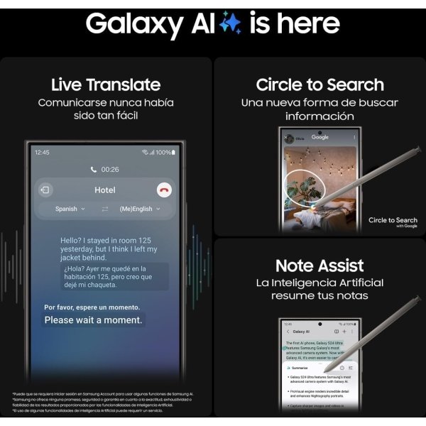 - Hazlo todo desde tu smartphone con Inteligencia Artificial: Galaxy S24 Ultra permite editar tus fotos sin esfuerzo, Traducción en tiempo real durante una llamada, Resumen de tus notas de forma clara