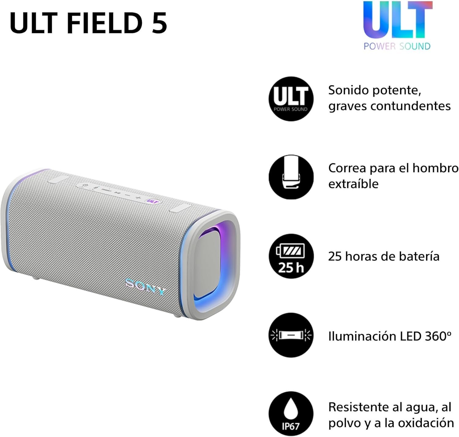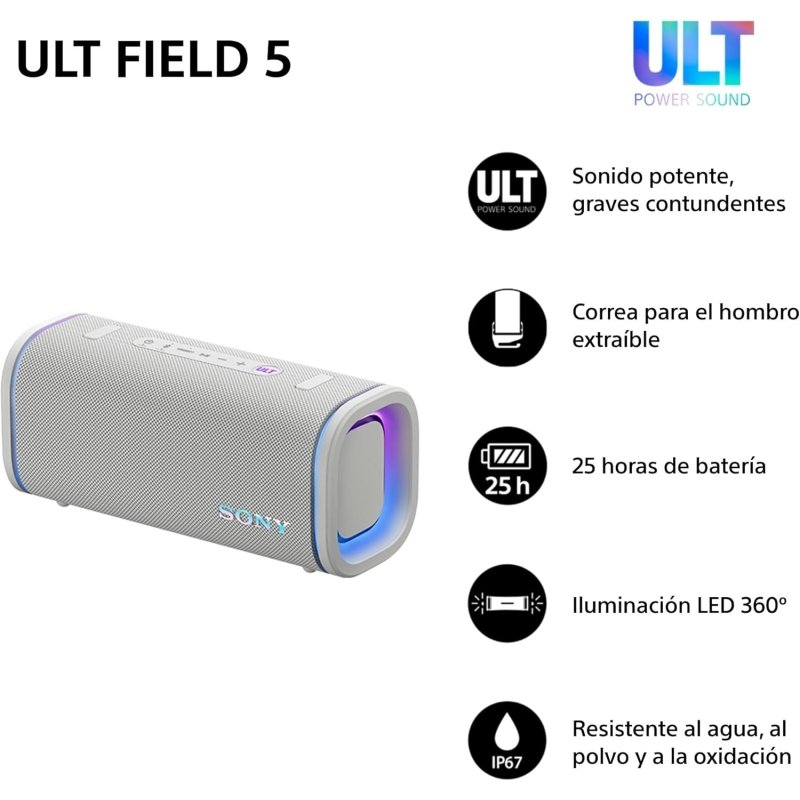 El Sony ULT Field 5 en color Blanco Marfil es un altavoz inalámbrico portátil diseñado para entornos interiores y exteriores. Este modelo integra una batería recargable que proporciona una autonomía de hasta 25 horas y utiliza un puerto USB-C para el proceso de carga. Cuenta con una certificación de grado de protección IP67, lo que asegura resistencia total al polvo, al agua y a la corrosión. La conectividad inalámbrica se establece mediante la versión de Bluetooth 5.2, permitiendo la sincronización con múltiples dispositivos. El fabricante no especifica una cifra oficial para la potencia de salida nominal (RMS) en sus especificaciones técnicas.
