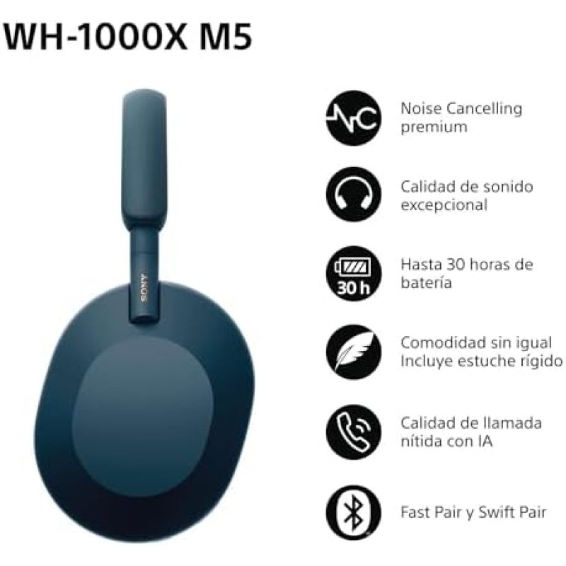 Los auriculares Sony WH-1000XM5 son un modelo de diseño circumaural (over-ear) que ofrece conectividad inalámbrica mediante Bluetooth 5.2 y opción de conexión física por cable. Este dispositivo integra un sistema avanzado de cancelación activa de ruido (ANC) gestionado por los procesadores V1 y QN1 de alta definición junto a ocho micrófonos. El modelo presenta un acabado en color azul medianoche y utiliza un puerto USB-C para la recarga de su batería interna. La autonomía alcanza las 30 horas con la función de cancelación de ruido activada y se extiende hasta las 40 horas si dicha función permanece desactivada. La unidad cuenta con diafragmas de 30 mm diseñados para la reproducción de audio de alta resolución y es compatible con la aplicación Sony Headphones Connect.