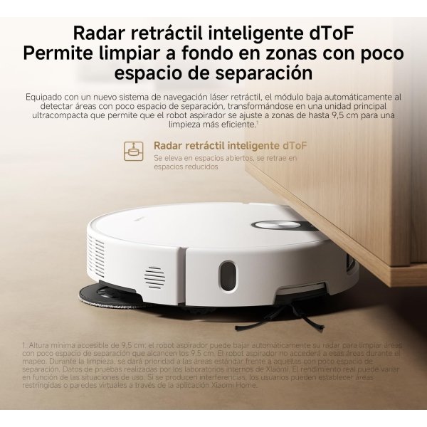 - "Mopa y cepillo lateral extensibles para una limpieza precisa en bordes y esquinas: El cepillo lateral y la mopa retráctiles se extienden automáticamente, limpiando el polvo a lo largo de las paredes y en las esquinas con precisión milimétrica. Combinado con un depósito de agua independiente y control preciso de salida, deja los suelos impecables y relucientes."