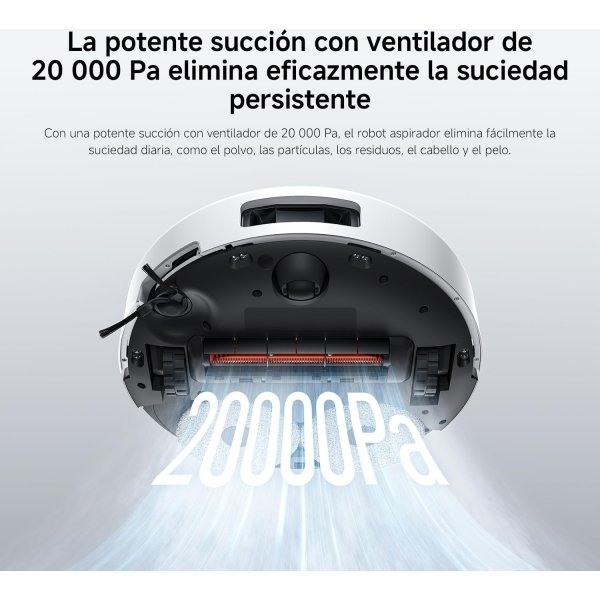 - Potente succión de 20.000 Pa para una limpieza a fondo: Con una increíble potencia de succión de 20.000 Pa, el robot aspirador elimina sin esfuerzo la suciedad diaria, como polvo, partículas, residuos, cabellos y pelo de mascotas.