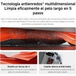 - Tecnología anti-enredos multidimensional Con un sistema de 5 pasos (barrer, enrollar, recoger, peinar y aspirar) y un cepillo principal en V, gestiona el pelo largo de forma eficaz.